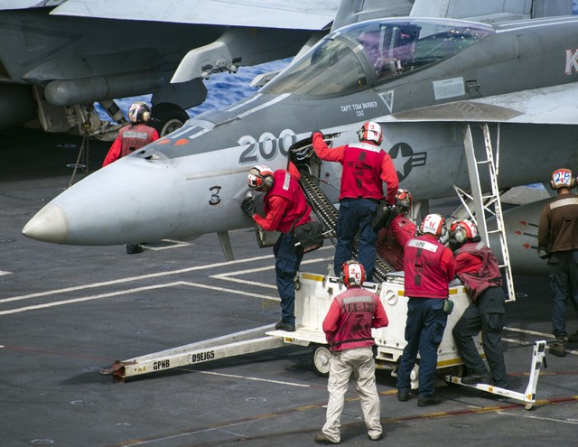 PACIFIC OCEAN: Sailors of VFA 137 rearm a F/A-18E